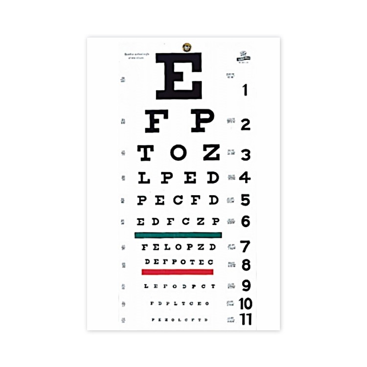 The Snellen eye chart is the familiar chart with the big letter or symbol at the top and progressively smaller letters at the bottom of the chart down to 20/20 or better.
