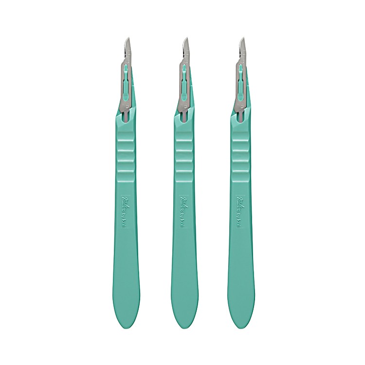 Sterile stainless steel, razor-sharp cutting edge. Safety sleeve for blade. Individually packaged.