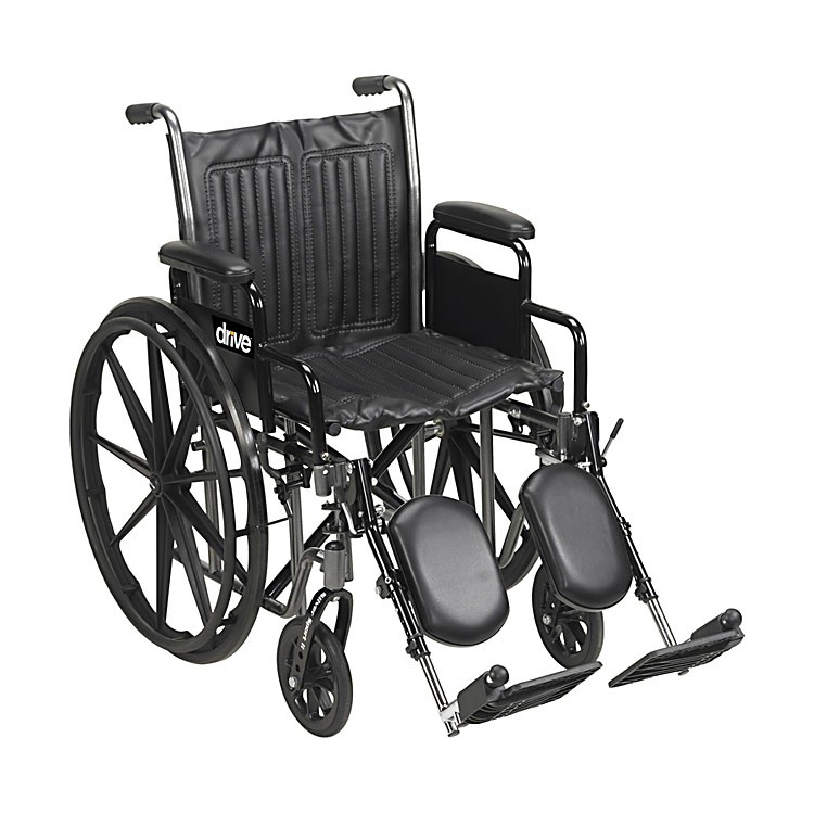 Powder-coated silver vein steel frame. Embossed vinyl upholstery is durable, lightweight, attractive and easy to clean. Urethane tires mounted on composite wheels provide durability and low maintenance. 8" front casters, adjustable in three positions. Padded armrests provide additional comfort. Carry pocket on backrest provides additional convenience. Comes with swing-away footrests or elevating leg rests with tool-free adjustable length riggings. Plastic foot plates with heel loops on footrests. Comes with push-to-lock wheel locks.