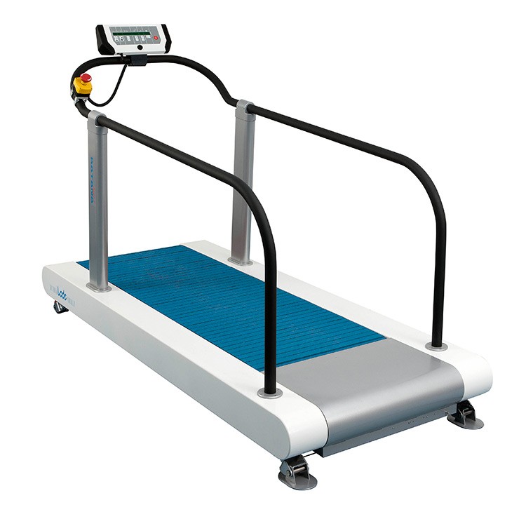 The treadmill is executed with a special Lode Slat Technology with 106 soft grip covered slats that allows for high speed and a natural walking and running experience. Its unique bearing technology delivers high speeds at low noise levels while needing low maintenance. The treadmill can be connected to other Lode products and to Lode Ergometry Manager that allows for managing protocols and real time adjustments.